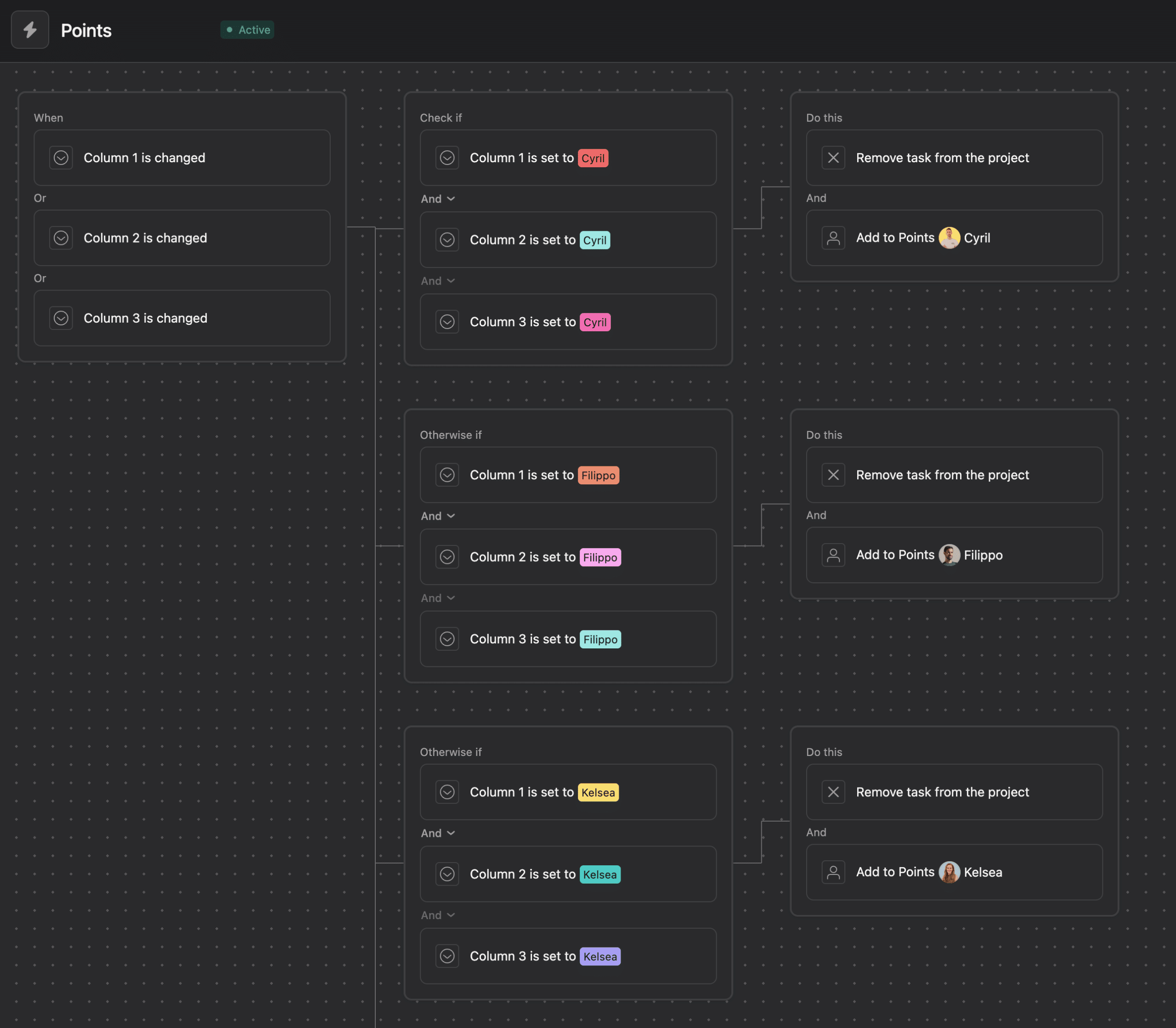 Colonne 1,Colonne 2, ouColonne 3est modifiée - Vérifier si → Les trois colonnes sont définies sur le même participant (créez une condition par personne)